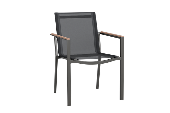 De Soho tuinstoel heeft een modern aluminium frame in lava, wit of beige, optioneel met teakhouten armleggers voor een warme uitstraling. De textileen zitting en rugleuning veren licht mee en bieden meer comfort dan een volledig aluminium zitting. Zonder kussen zit de stoel al prettig, met een bijpassend tuinkussen nóg comfortabeler. Dankzij het stapelbare ontwerp is de stoel eenvoudig op te bergen.