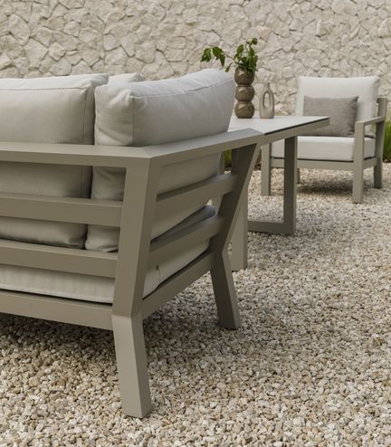 De Timber loungeserie heeft een robuust frame van dikwandig aluminium in lava, wit of beige voor duurzaam buitencomfort. Voor wie een natuurlijke uitstraling zoekt, is Timber ook verkrijgbaar in nature: volledig gemaakt van duurzaam teakhout.