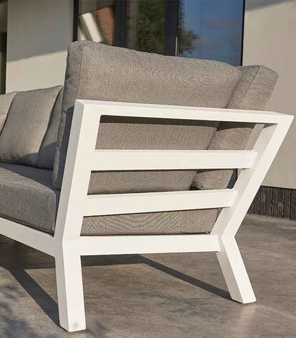 De lounge heeft een actievere zit, waarbij je iets rechter op zit dan bij een diepe lounge. De zitting bestaat uit een sling doek: flexibel textileen dat licht meeveert en daardoor comfortabeler zit dan een volledig aluminium zitvlak. De royale, dikgevulde kussens – verkrijgbaar in maar liefst negen kleuren – verhogen het zitcomfort verder.